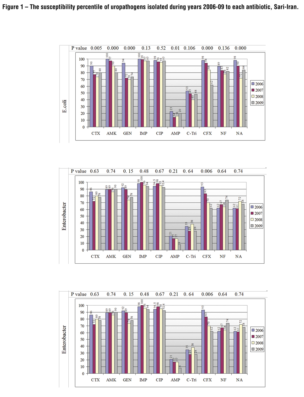 Urinary tract infection (UTIs) are common in childhood, occurring in about 5% of febrile infant and 2% of febrile children < 5 years of age (1-3). UTIs pose a significant health risk due to progress to urosepsis, renal scarring and/or progressive kidney damage (4-6). The prognosis depends on timely administration of appropriate antimicrobial treatment. Antibiotic therapy is generally initiated immediately and empirically even before bacteriological culture results are available (1-6). There is a growing concern about the increasing antimicrobial resistance of the causative organisms of UTIs worldwide (7). The increasing resistance trends are likely to have important clinical implications for the empirical use of antibiotics (8,9). When prescribing empirical therapy for infections in the community and in the hospital, it is important to know the national and local antibiotic resistance patterns of different organisms. This requires permanent monitoring to gatter information for providing new therapeutic options (7-9). The aim of this study was to determine the relative frequency of bacterial species causing UTI and their susceptibility patterns to most commonly used antibiotics during a four years-study period (2206-2009). Also, in order to document the resistance trends of isolated uropathogens to these drugs, the collected data were compared to the findings of a similar earlier report (10) to evaluate the most appropriate options for initial empirical therapy of UTI for children in the region.