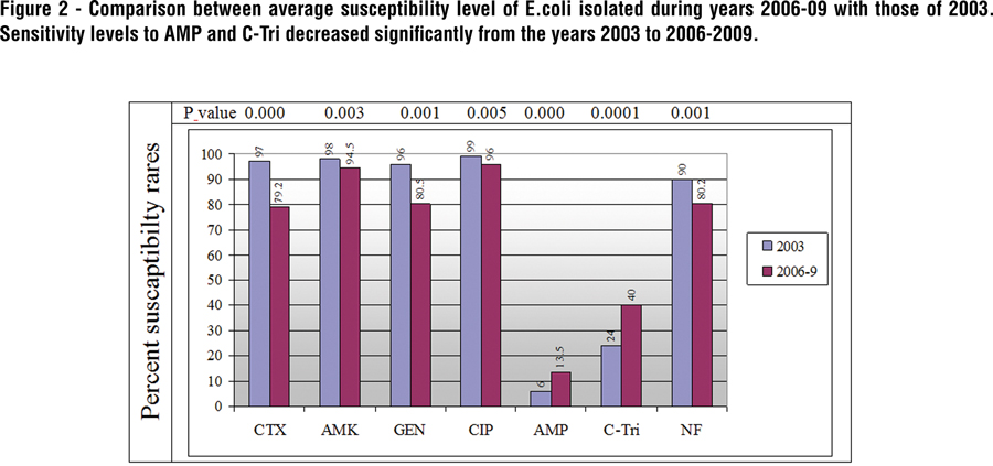 During the study period (2006-2009) E.coli resistance prevalence to CTX, CFX, AMK, GEN and NA increased significantly (Figure-1). For Enterobacter this trend was observed only for CFX and for other gram negative bacilli to CFX and GEN (Figure-1). Based on the results of this study, the first three most effective antibiotics for initial empiric therapy were IMP, CIP, and AMK with 96.7, 95, and 91% susceptibility rates respectively. These were followed by CTX (77.2%), GEN (77%) NF (76.4%), NA (74.3%), and CFX (70%) (Table-2). When these findings were compared with similar data collected during 2002-2003, the results indicated an statistically significant increase prevalence of resistance of E.Coli to most comparable data except AMP and C-tri, which showed a significant decrease (Figure-2). For other uropathogens, this pattern was not observed and the susceptibility rates for most tested antibacterial agents did not change significantly from the years 2002-2003 to 2006-2009. However, due to the decreasing relative role of infection with Pseudomonas spp during years 2006-2009 (data not shown), the sensitivity of gram negative bacilli to CTX improved significantly as compared to the year 2003.