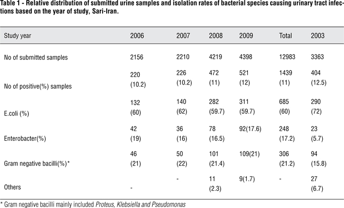 From January 2006 to 2009, a total of 12983 urine samples were submitted for analysis and culture. These samples showed 1439 bacterial isolates. Enteric gram-negative bacilli accounted for 1419 of 1439 (98.6%) of isolates. Escherichia coli (E.coli) was the main uropathogen (865 (60%) of isolates) followed by: Enterobacter 248 (17.2%), and other gram negative bacilli (GNB) including Proteus, Klebsiella, Pseudomonas etc (306 (21.2%)). In the initial study (January 2002 to 2003) 404 uropathogens from 3363 urine samples were isolated. The results are shown in Table-1.