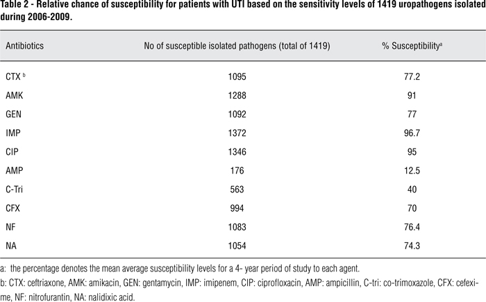 Purpose: Empirical initial antibiotic treatment of UTI must rely on susceptible data from local studies.