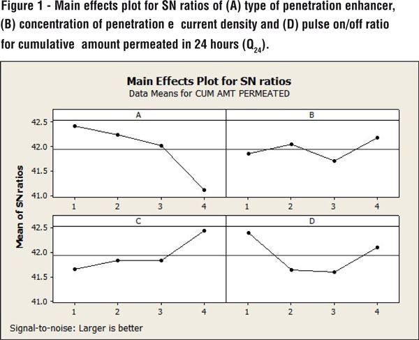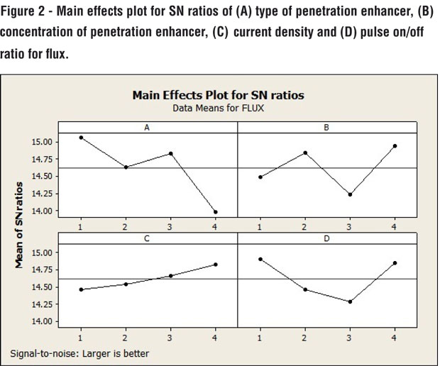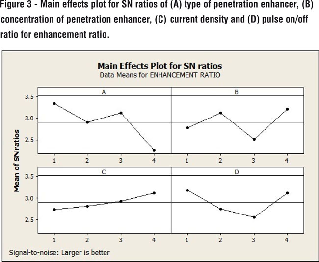 Hence, based on these reports, type of penetration enhancer, concentration of enhancer, current density to be applied and current pattern (pulse on/off ratio) were selected as factors and their effect on response variables were studied by Main effects plots of SN Ratios.