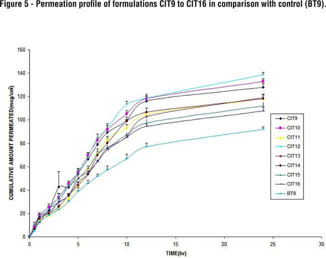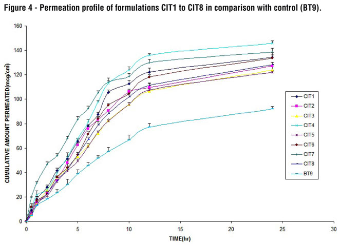 Maximum cumulative amount permeated in 24 hrs (Q24) was 145.71 ± 2.00µg/cm2 by CIT4 followed by CIT7 and CIT12 (138.84 ± 2.90µg/cm2, 138.64 ± 2.20µg/cm2) respectively. Permeation was least enhanced by CIT16 (107.58 ± 3.22µg/cm2) when compared with control (91.89 ± 2.30µg/cm2). The permeation profile of different formulations is shown in Figure 4 and 5.