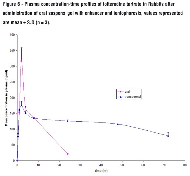 There were significant differences in Cmax and AUC0-72 between the optimized tolterodine gel and the oral suspension. The overall mean value of AUC0-72 by transdermal route was 3.17 times higher than that of oral route, and the difference was found to be statistically significant (p < 0.005). The optimized tolterodine gel had a relative bioavailability of 317% compared to oral suspension.