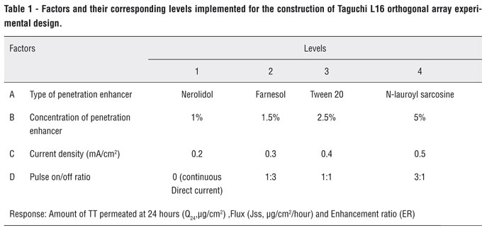 In transdermal drug delivery, overcoming stratum corneum barrier is challenging and the novel method is synergism of chemical and physical enhancer. In the present study, synergistic effect of chemical enhancers and iontophoresis technique on permeation of TT has been determined. In this study, Taguchi robust design was used to optimize the formulation and four factors and four levels were selected from preliminary studies and literature reports by previous researches.