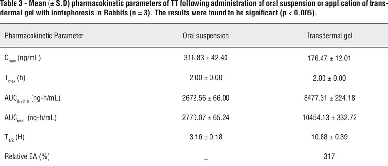 Plasma drug concentration vs. time profiles of TT after topical administration of the optimized formulation and oral suspension to three rabbits are shown in Figure-6. Dose of 2mg TT per 5mL suspension was administered orally and for transdermal formulation dose of 0.7mg TT per 1000mg of gel was applied. Blood samples were collected only for 24 hours in case of oral formulation as TT half life is 1.9-3.7 hours and its dosing frequency is twice a day where as in case of transdermal as it is sustained release dosage form so samples were collected for 72 hours. Pharmacokinetic parameters calculated from the plasma drug concentration vs. time profiles are listed in Table-3. Maximum concentration of 316.83 ± 42.40ng/mL was obtained with oral suspension when compared with transdermal gel (176.47 ± 12.01ng/mL). Half life (T1/2) of the formulation was increased from 3.16 ± 0.18 hour by oral suspension to 10.88 ± 0.39 hours by transdermal gel.