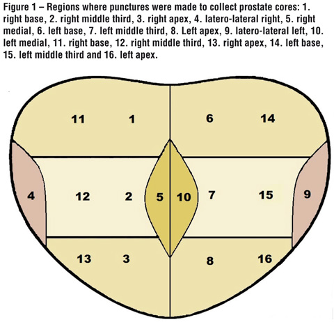 Sixteen punctures were performed, obtaining cores bilaterally from the following regions of the prostate: the base, middle third, apex, medial (transitional zone), and latero-lateral. After collecting these cores, six additional punctures were made bilaterally in the more lateral regions of the base, the middle third, and the apex (Figure-1).