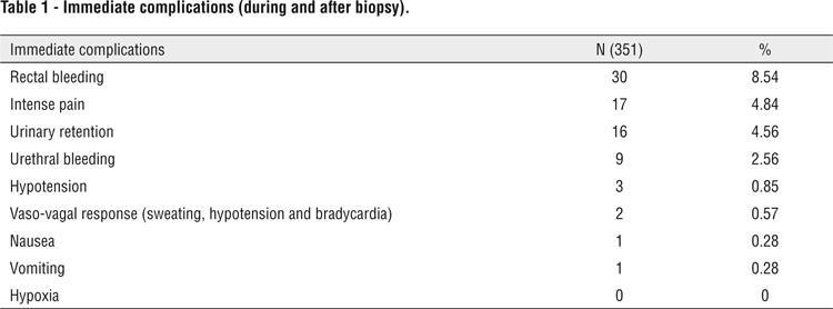 Of the 351 patients who underwent the procedure, the immediate complications (during and after biopsy) were rectal bleeding, intense pain, urinary retention, urethral bleeding, hypotension, vaso-vagal response (sweating, hypotension, bradycardia), nausea and vomiting (Table-1).