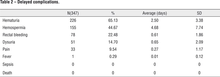 In 347 patients, long-term complications were hematuria, hemospermia, rectal bleeding, dysuria, pain and fever. There were no cases of sepsis and death (Table-2). We had a loss of four patients who did not return to the clinic to complete the questionnaire of long-term complications.
