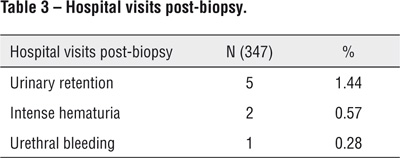 Eight patients sought emergency hospital care after the biopsy due to urinary retention, intense hematuria and urethral bleeding (Table-3).