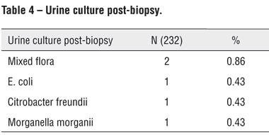 After the prostate biopsy procedure, urine samples were collected for culture in 232 patients, five of which were positive (2.15%) (Table-4). Of the 351 patients submitted to the prostate biopsy, eight patients (2.27%) were catheterized with an indwelling catheter, and did not have urine samples collected.