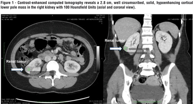 Mete et al (7) reported a similar case in which a 14-year-old boy with hypertension and preoperative diagnosis of reninoma underwent open nephron-sparing surgery for a 2 cm mass in right kidney. The patient became normotensive postoperatively and follow-up intravenous urography showed bilateral normally functioning kidneys. Although image exams may find renal masses that could be associated to secondary arterial hypertension, there are other methods to prove such association. Wong et al (9) demonstrated the utility of both appropriate imaging studies and selective venous catheterization following provocative administration of an ACE-I for diagnosis of reninoma. We do not perform selective venous sampling routinely since it is a more invasive technique. Nevertheless, it may help in cases where all other diagnostic modalities have been performed and doubt regarding the specific cause of secondary hypertension persists.