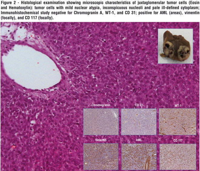 Laboratory screening included serum sodium, calcium, potassium, aldosterone, renin, cortisol, catecholamines, and urinary metanephrines. Initial work-up revealed mild hypokalemia (3.4 mEq/L) and increased renin levels (7.7 ng/mL/h) with normal aldosterone (22 ng/dL). Other hormone levels were within normality. Doppler ultrasound did not reveal any abnormality in renal vessels flow. However, a 2.5 cm hypoecogenic mass was found in the right kidney. Contrast-enhanced computed tomography of the abdomen demonstrated a 2.8 cm, well circumscribed, solid, hypoenhancing cortical lower pole lesion in the right kidney with 100 Hounsfield Units (Figure-1). The patient was counseled on options regarding radical nephrectomy and nephron-sparing surgery, as well as alternative for open or laparoscopic intervention. She decided for laparoscopic partial nephrectomy and the procedure was accomplished without intra-operative complications. Total surgical time was 120 minutes and renal hilum clamping time was 14 minutes. Bleeding was negligible. The patient had an uneventful recovery and was discharge home in postoperative day one. Histopathologic examination revealed a rare juxtaglomerular cell tumor known as reninoma (Figure-2) after minucious immunohistochemical analysis, which was negative for Cytokeratin 35BH11, EMA, CD 34, CD 56, S-100, Chromogranin A, HMB-45, WT-1, and CD 31; and positive for AML (areas), vimentin (focally), ACTIN HHF35 (rare cels), and CD 117 (focally). Patient’s blood pressure normalized within 2 months of surgery (Systemic Blood Pressure < 120x90 mmHg), allowing withdrawn of all medications.