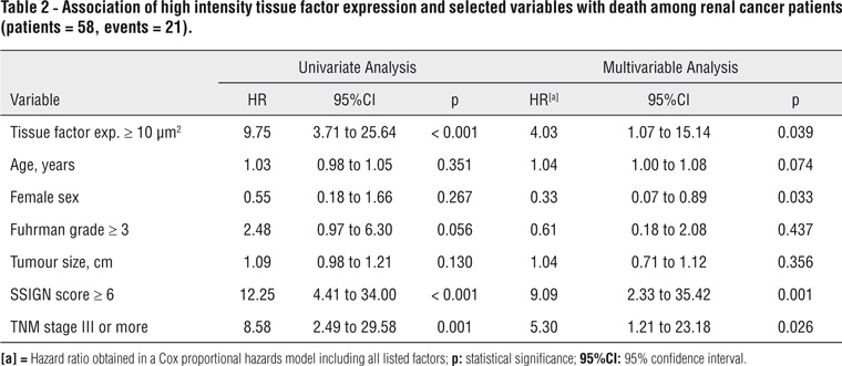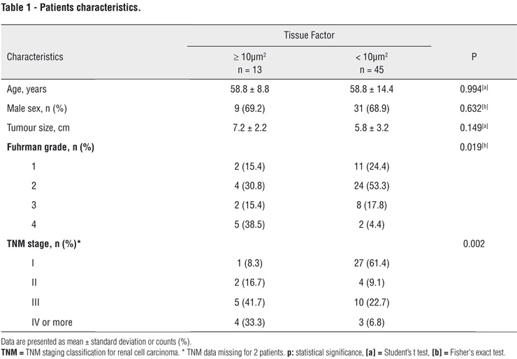 Materials and Methods: immunohistochemical expression of tissue factor was evaluated in 58 paraffin-embedded samples of clear cell carcinomas of the kidney treated at the same university hospital, that was correlated with clinical and pathological variables and with overall survival.