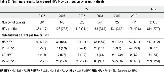Results: Overall, 814 out of 2,938 patients (27.7%) and 292 out of 1,081 controls (27.0%) proved positive to HPV. The HPV genotype distribution was as follows: HR-HPV 478 (43.3%), PHR-HPV 77 (6.9%), LR-HPV 187 (16.9%) and PNG-HPV 364 (32.9%). The most common HPV genotypes were: 6, 11, 16, 26, 51, 53 and 81. No difference was found between the two groups in terms of HPV infection (OR 1.03; 95% CI 0.88-1.22; p = 0.66). We noted a statistically significant increase in HPV infection over the period 2005 to 2010 (p < 0.001) in both groups. Moreover, we found a statistically significant increase in HPV 16 frequency from 2005 to 2010 (p = 0.002).