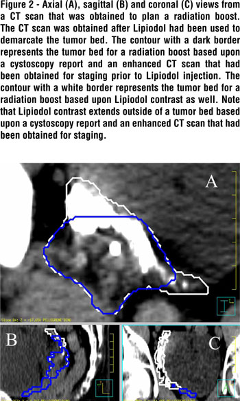 Reliable tumor bed demarcation on a treatment planning CT scan without Lipiodol is challenging. In many cases, a cystoscopy report and CT scan for staging do not allow a radiation oncologist to later accurately contour the tumor bed on a radiotherapy treatment planning CT scan. A preferred approach is for an urologist to visualize the tumor bed at the time of cystoscopy and to demarcate the tumor bed with Lipiodol immediately following maximal TURBT. In this report, Lipiodol helped to reduce inter-observer variability regarding the extent and location of the tumor bed on a treatment planning CT scan for a radiation boost (Table-3). In 40% of patients in this study, the CTVboost based upon Lipiodol extended outside of a PTVboost that would have been treated based upon cystoscopy reports and enhanced CT scans without Lipiodol. Similarly, Pos et al. (4) reported that quite often the extent, or sometimes even the location, of Lipiodol spots was different from what the radiation oncologists would have contoured based upon cystoscopy reports and CT scans without Lipiodol.