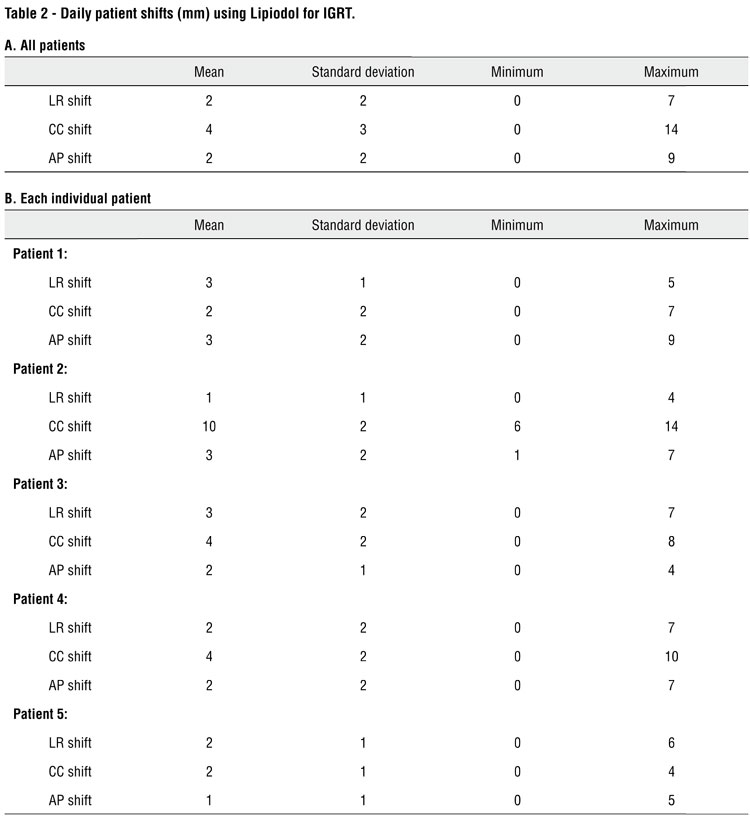 Mean daily patient shifts are presented in Table-2. There was a mean ± standard deviation absolute shift of 2 ± 2mm in the LR direction, 4 ± 3mm in the CC direction, and 2 ± 2mm in the AP direction. There was a maximum shift of 14 mm in the CC direction in one patient. Shifts greater than 5 mm were made in 4% (LR), 27% (CC), and 8% (AP) of the total number of daily radiotherapy fractions for all patients.