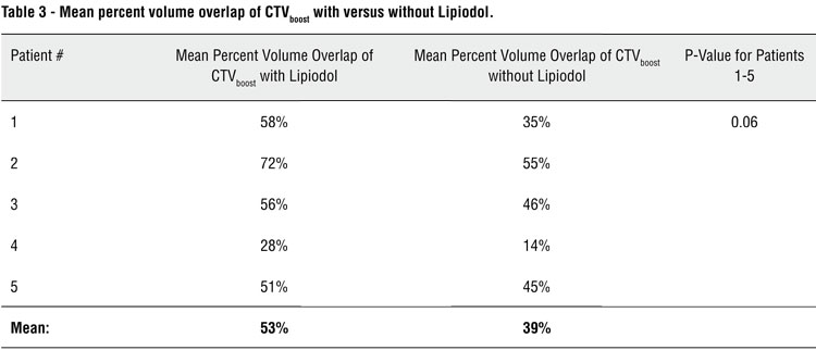 Figure-2 shows the CTVboost with versus without Lipiodol. Lipiodol made it easier to define the extent and location of the tumor bed on a treatment planning CT scan for the radiation boost. The mean PVO was 53% with Lipiodol versus 39% without Lipiodol (Table-3; p = 0.06). In two of 5 (40%) patients, the CTVboost based upon Lipiodol extended outside a planning target volume that would have been treated with a radiation boost based upon cystoscopy reports and enhanced CT scans for staging.