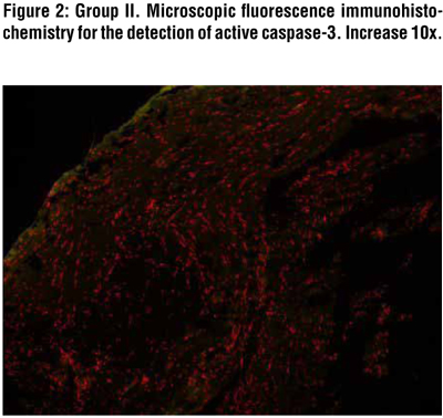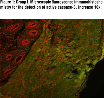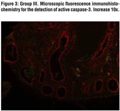 The figures 1 to 3 show the immunohistochemical method used for the detection of active caspase 3 on the prostatic tissue in the three different groups. The positive reactions are seen in green and the nucleus in red.