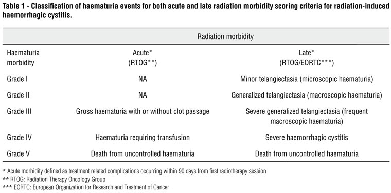 Bladder complications may occur within 2 months to > 20 years following completion of pelvic radiotherapy (1,14). Their incidence ranges from 5 to 12%, with haemorrhage presenting in up to 9% of cases (1). Severe RTOG/EORCT grade III or worse bladder morbidity has been reported at 1% at 5 years, 1.4% at 10 years and 2.3% at 20 years following radiotherapy for cervical cancer (20). Radiation for prostate cancer may lead to moderate or severe haematuria in 3-5% of cases (10,12.