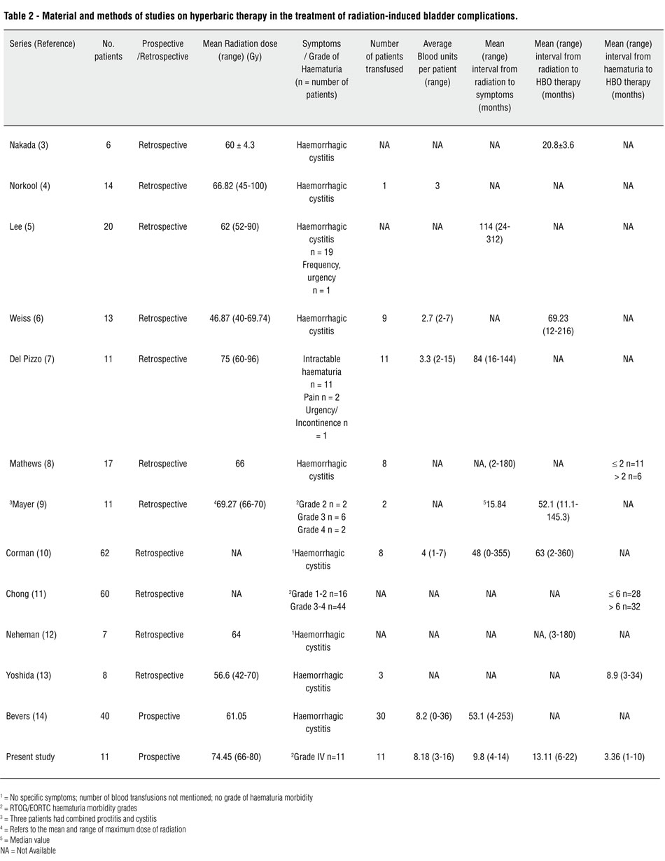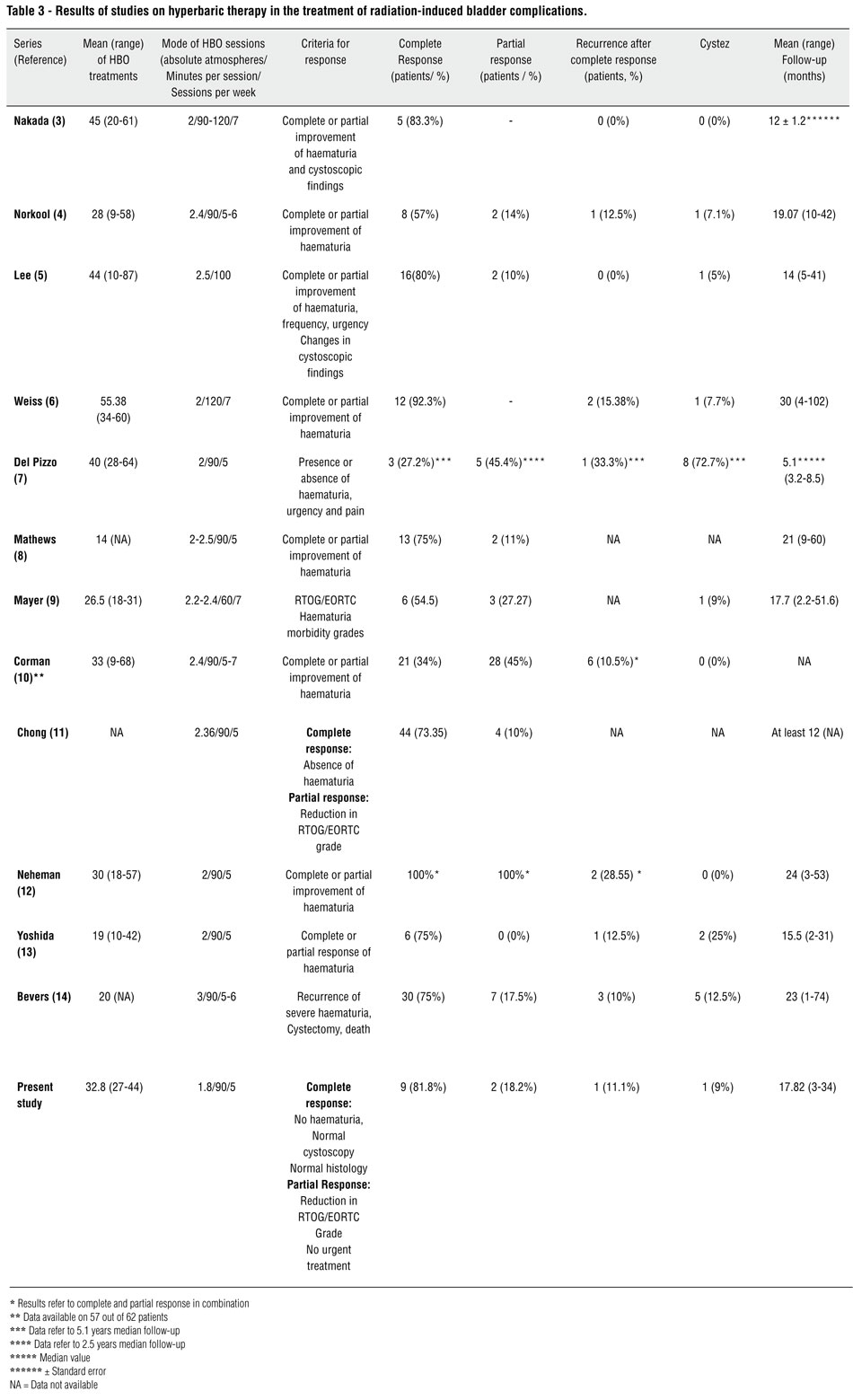 Several series of radiation-induced haemorrhagic cystitis treated with HBO have been reported (2-14). Tables 2 and 3 present indications and results for most of them. The vast majority are retrospective in nature. Endpoints have been set prospectively in only one study (14). These included recurrence of severe haematuria, cystectomy, or death. Forty patients were recruited, all of which had had previous unsuccessful treatments for radiation cystitis. In addition, although a mean transfusion need of 8.2 units per patient was reported, a specific classification system of haematuria morbidity was not used and patients presented with various haematuria grades according to RTOG/EORTC criteria, leading to a diversity of results. Similar to our study, a classification of the severity of haematuria according to transfusion needs was used. However, no statistical analysis was provided and HBO failure was seen only in 3 patients with a mean transfusion need of 25.7 units. Finally, neither the total Gys received nor the time interval elapsed from initiation of HBO therapy to onset of haematuria, were correlated to HBO success rate. Overall, haematuria disappeared completely or improved in 37 patients (92.5%). With a median follow-up of 23 months, in 9 patients haematuria recurred, representing a recurrence rate of 0.12/year (14). Bladder preservation was achieved in 36 of patients. Based on their results the authors inferred in their conclusion that HBO should not be reserved only for severely affected and conventional therapy-resistant patients.