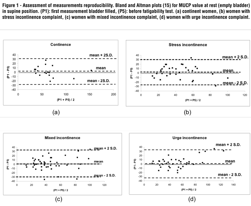 Whatever the continence status, there was a good reproducibility during a session of the resting MUCP (empty bladder) (P1 and P5) (t-test and Bland-Altman plots, Figure-1).