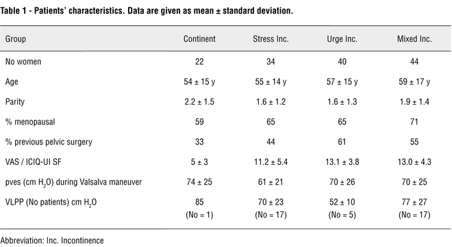 The studied population consisted of 140 consecutive women without neurological disease or/and pelvic organ prolapse of grade > 2 (mean age 56.8 ± 15.5 years [21-90 years]) referred for evaluation of lower urinary tract dysfunction (June 2007 to March 2009). Each woman completed a 3-day frequency-volume chart and the ICIQ-UI-SF before the urodynamic testing; this allowed a stratification of the population in four groups according with the symptoms: continent, with stress incontinence, urge incontinence, or mixed incontinence. The continent women complained of urgency or pain.