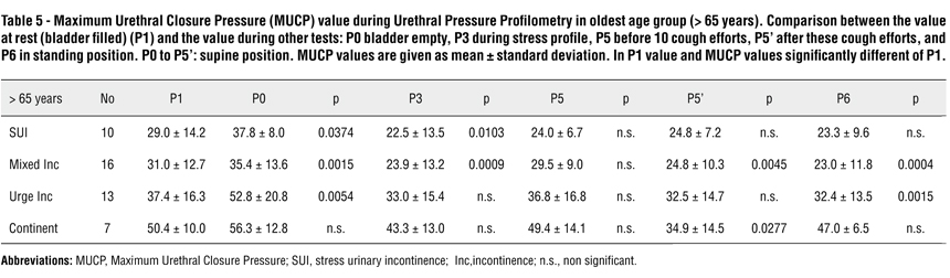 In the oldest group (Table-5) with SUI, the change in MUCP was significant with filled bladder (P1) vs. empty bladder (P0) (p = 0.0374) and during the stress profile (P3) (p = 0.0103). Changes in MUCP were observed in all tests for the mixed incontinence subgroup but only with empty bladder (P0) (p = 0.0054) and standing (P6) (p = 0.0015) in the urge subgroup. In the continent subgroup, MUCP decreased only after fatigability test (P5’).