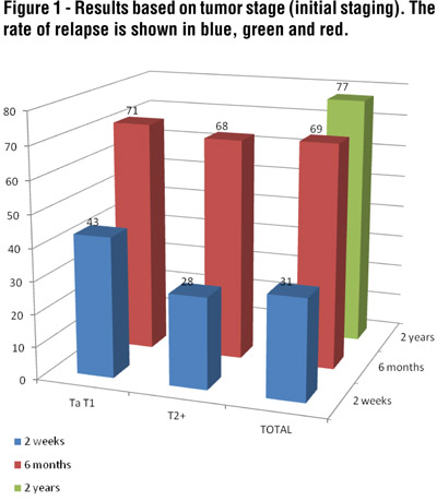 There was no statistical difference in the length of the period to relapse found between the subgroups: In tumor stage subgroups (3.1 months vs. 3.3 p > 0.05) or in PS subgroups (3.4 vs. 3.5 months p > 0.05). After 2 years, 7 patients (23%) had no hematuria.