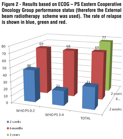 Two protocols A and B were used, depending on the general health conditions of the patient as follows: Protocol A (13 patients) delivered 30 Gy in 10 fractions for 2 weeks, if the ECOG PS was less than or equal to 2. Patients in group B (19 patients) underwent a hypofractionated regimen of 20 Gy in 5 fractions for 1 week if they had a ECOG PS of more than 2.
