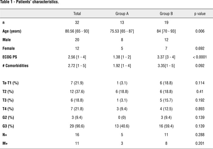 Group A was younger than group B (75.53 vs. 84 years, p = 0.006). The mean performance status (PS) based on ECOG criteria was 2.56 for the general cohort. Group A had a lower PS than group B (1.38 vs. 3.37; p < 0.0001). The mean number of major comorbidities was 2.72 in the general cohort, with less co-morbidities in group A than group B (1.92 vs. 3.26, p = 0.092).