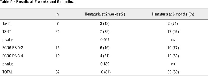 Results: At 2 weeks, 69% of patients were hematuria-free. Subgroup analysis showed that 79% of patients undergoing hypofractionated regimen were hematuria-free. A total of 54% were hematuria-free with the standard regimen. Based on tumor stage, hematuria was controlled at 2 weeks for 57% of non-muscle invasive tumors and 72% of muscle-invasive tumors. After 6 months, 69% of patients had relapsed, regardless of tumor stage or therapy schedules.