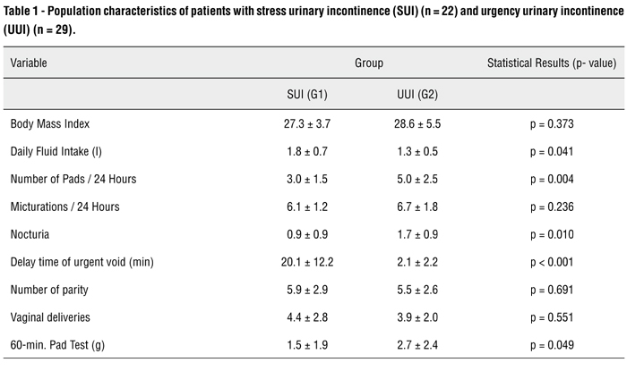 Results: Median of age, mean number of pads / 24 hours, nocturia and warning time were significantly higher in UUI comparing to SUI group. During UST, 45.45% in G1 and 3.44%, in G2, were able to interrupt the urine stream (p < 0.001). The 60-min. Pad Test was significantly higher in G2 compared to G1 women (2.7 ± 2.4 vs 1.5 ± 1.9 respectively, p = 0.049). Objective evaluation of PFM strength was significantly higher in the SUI than in the UUI patients. No statistical difference was observed regarding other studied parameters.