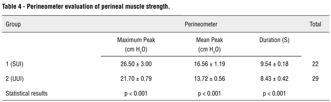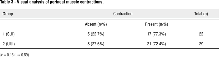 The visual analysis of perineal muscle contractions showed no statistical difference between groups, what may demonstrate the ineffectiveness of this modality of PFM evaluation, whereas the perineometer test presented a significant deficit of muscular strength in the UUI group compared to the SUI one. Despite this, Deveuse et al. (14) observed that visual inspection and digital test are easy and reliable methods to evaluate PFM strength.