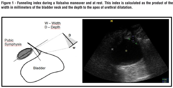 The extent of dilatation of the proximal urethra was gauged by measuring the funneling index during the Valsalva maneuver and at rest. The funneling index is calculated as the product of the width in millimeters of the bladder neck and the depth to the apex of urethral dilation (13, 18) (Figure-1).