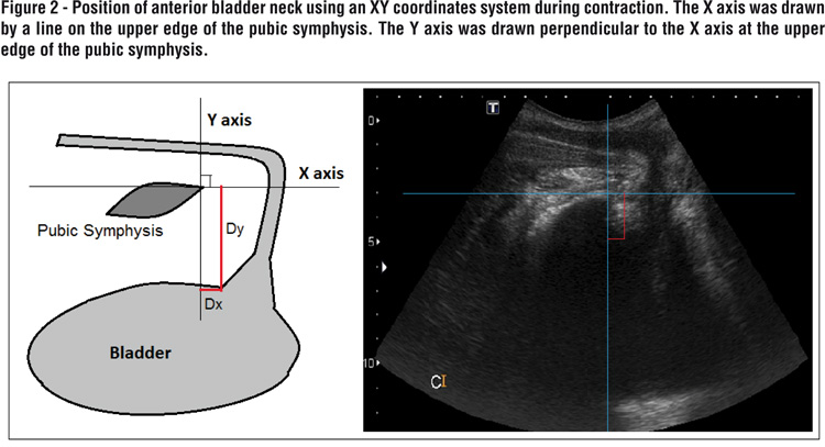 The position of the bladder neck was determined at rest, during the Valsalva maneuver and during pelvic floor contraction. Measurements were made using an XY coordinate system, with the pubis as the reference point. The X axis was drawn by a line on the upper edge of the pubic symphysis. The Y axis was drawn perpendicular to the X axis at the upper edge of the pubic symphysis.