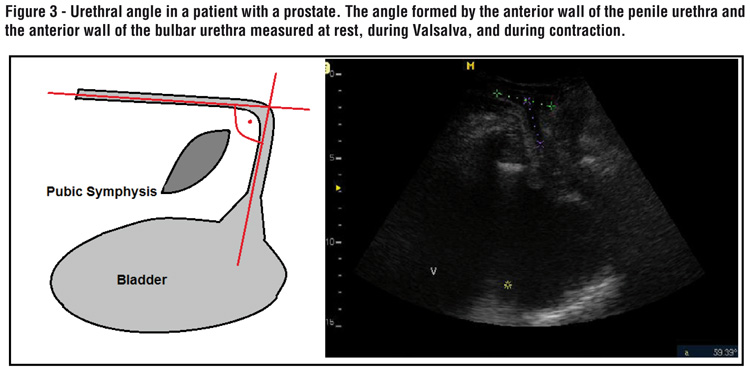 The presence of an intact prostate in control group subjects made it technically difficult to evaluate the bladder neck during the ultrasound examination. To address these challenges we added two more measurements: urethral angle and distance of the pubis. The urethral angle was defined as the angle formed by the anterior wall of the penile urethra and the anterior wall of the bulbar urethra, and was measured at rest, during Valsalva, and maximum contraction (Figure-3).
