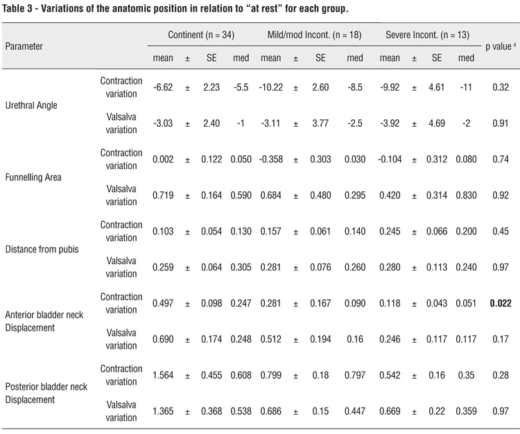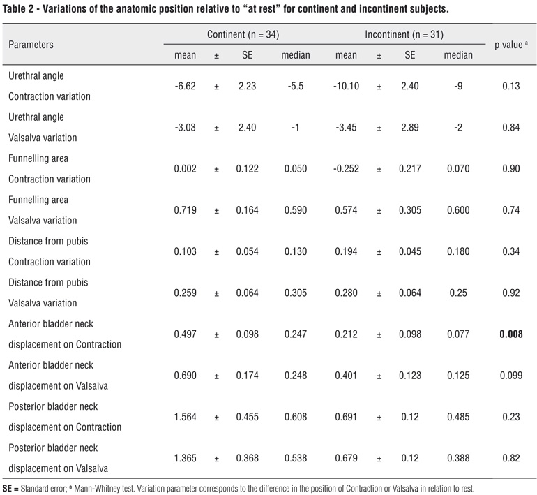 Table-2 provides the mean, standard error (SE) and median variations of anatomical parameters in relation to “at rest” according to group (continent and incontinent) and the corresponding descriptive level (p value) of Mann-Whitney.