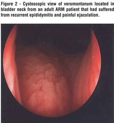 Associated urological abnormalities were presented in 22 patients (85%) (Table-1). The most common urologic associated anomaly was vesicoureteral reflux in thirteen patients (50%). Seventeen ureters refluxed in these thirteen patients with grade of reflux known in seven patients with twelve refluxing ureters. The known grades of reflux in these seventeen refluxing ureters were: Grade 1 (n=1), Grade 2 (n=8), Grade 3 (n=3), Grade 4 (n=2) and Grade 5 (n=3). An ectopic ureter inserting into vas deferens was identified in five patients (19%). Six patients underwent surgery for either an ectopic location (n=5) or persistent reflux despite maximal medical therapy (n=1). Two of the five patients with the ectopic ureteral location to the vas deferens underwent nephroureterectomy due to poor function of the renal moiety while the remaining three patients underwent reimplantation. Cystoscopy was performed in 18 patients, however most patients had their cystoscopy performed in conjunction with their original anorectoplasty rather than following the episode of epididymitis. Cystoscopy revealed the verumontanum located in bladder neck in one patient who presented with ejaculatory dysfunction (Figure-2).