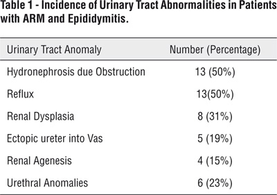 CONCLUSION: Epididymitis in a patient with ARM warrants a comprehensive urologic investigation, particularly in recurrent episodes. Attempts at surgical intervention (e.g. vasectomy) should be avoided until functional assessment of the urinary tract has occurred. Failure to recognize this association may lead to potentially avoidable complications and morbidity. Long term urological follow up of these patients is warranted to identify at risk patients and minimize renal deterioration