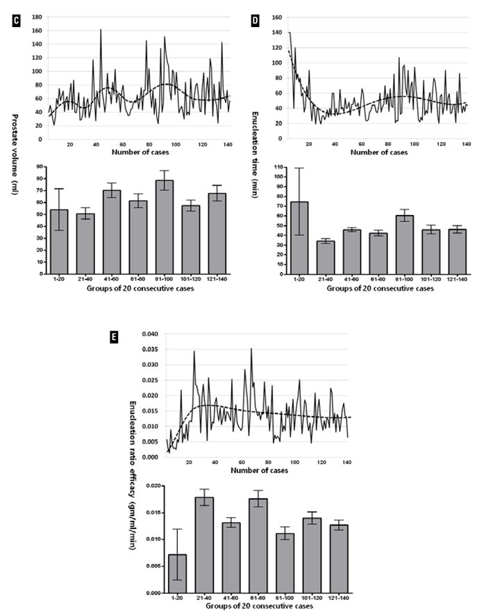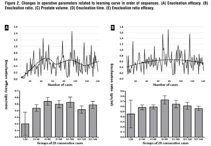 Materials and Methods: One-hundred and forty (n=140) consecutive patients who underwent HoLEP from July 2008 to July 2010 by a single surgeon (SJO) were enrolled. Perioperative clinical variables, including enucleation time, morcellation time, enucleation ratio (enucleation weight/transitional zone volume), enucleation efficacy (enucleated weight/enucleation time), enucleation ratio efficacy (enucleation ratio/enucleation time), and early complication rate were analyzed.