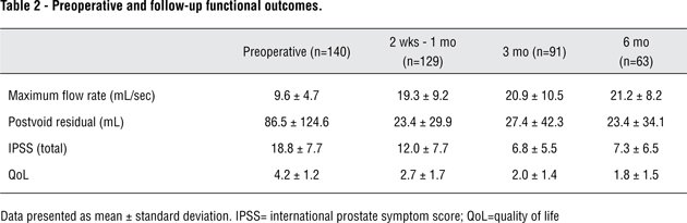 The clinical outcomes were not different between the groups along cases. In all patients, objective outcomes (maximum flow rate and post void residual volume) significantly improved immediately from the first visit. In contrast, subjective outcomes, especially IPSS total score, stabilized 3 months after surgery.