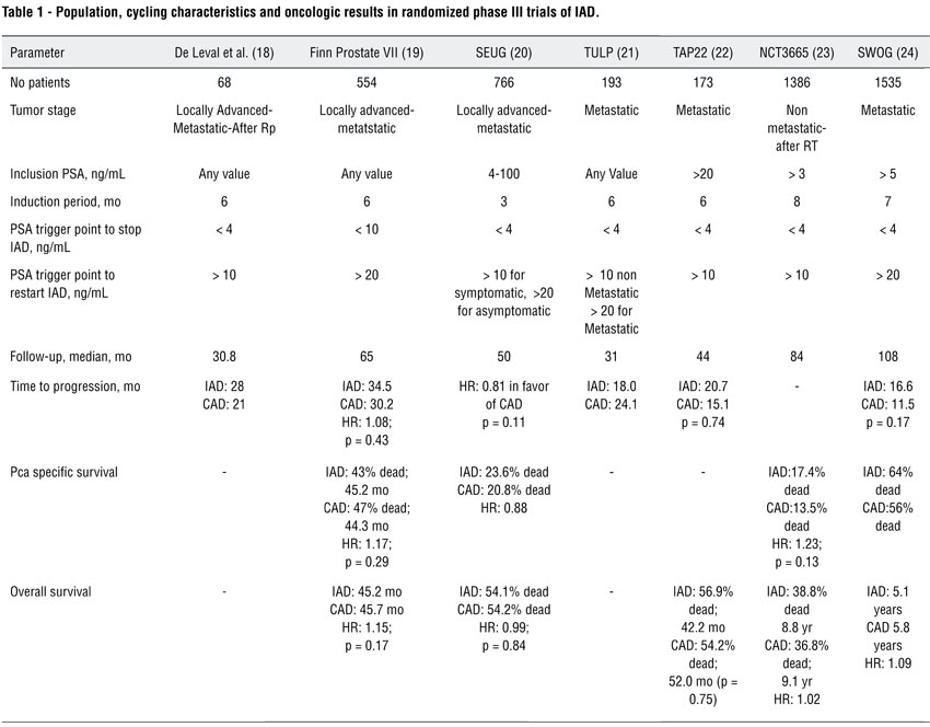 Calais da Silva et al., (20) in the Southern European Uroncological Group (SEUG) study enrolled 766 patients with locally advanced or metastatic cancer who received a 3-month induction treatment with GnRH analogue and cyproterone acetate. Patients with PSA nadir value below 4ng/mL or a 80% reduction in the initial pre-treatment PSA were randomized in 2 groups (626 patients). In the IAD arm, in men with PSA nadir below 4ng/mL, PSA trigger for reinitiating treatment was 10ng/mL for symptomatic patients and 20ng/mL for asymptomatic patients. In men with 80% reduction of the pretreatment PSA, therapy reinitiated when PSA value rose to 20% of the nadir measurement. In the continuous arm complete androgen deprivation was deployed. There was no difference in overall survival [HR 0.99; CI 0.80 to 1.23] and disease progression [HR 0.81; p = 0.11] between the two groups. In the IAD arm, cancer deaths were higher whereas in the CAD arm cardiovascular deaths increased. Furthermore, cost was by far reduced in the IAD arm. Time to castration-resistance was non-significantly different between the two groups. Authors concluded that intermittent therapy should be considered for use in routine practice and that an on-treatment phase of only 3 months seems to be efficient. However, the majority of these trials enrolled heterogeneous populations such as patients with different disease stages.