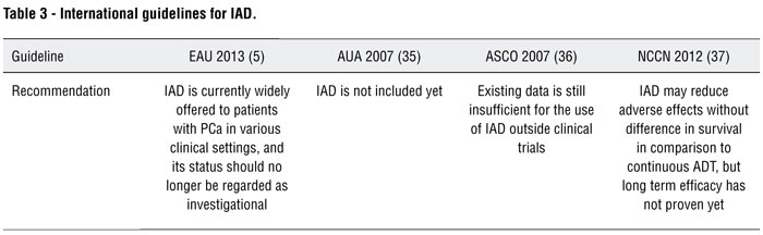 EAU was the first international urological association that included IAD as an alternative therapy for advanced prostate cancer in its 2012 guidelines stating that IAD should no longer be considered as investigational (25). EAU stated in the guidelines that the possible benefit of CAD in disease progression is balanced by the increased toxicity and adverse effects, leading to absence of difference in overall survival. According to EAU, although the overall amelioration in the QoL is less than the expected, IAD is better tolerated having benefits for the sexual functioning.