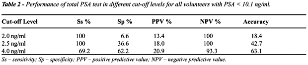 and specificity of tPSA in a cut-off of 4 ng/ml, for Southeastern population,