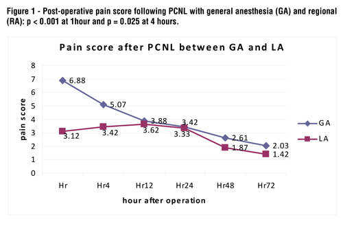 Mean preoperative and postoperative 24 hours hemoglobin and hematocrit levels in both Groups are shown in Table-3. A higher satisfaction score (level 4, 5) was found in the regional epidural group. Patients with epidural anesthesia needed smaller amounts of postoperative analgesic drug. A reduced analog pain score in regional epidural anesthesia was found at 1 hour and 4 hours postoperatively (Table-4, Figure-1). Patients who underwent PCNL with general anesthesia received more analgesic drugs (Table-5).