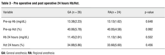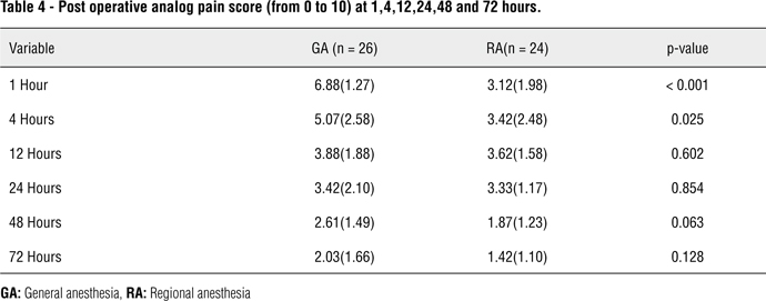 Results: Average pain score at 1 hour. was 6.88 in group I and 3.12 in group II (p < 0.001), at 4 hours. 5.07 in group I and 3.42 in group II (p = 0.025). Less morphine was required in the regional epidural anesthesia group compared to the general anesthesia group. Higher satisfaction was found in the regional epidural group. 6 (23.07%) patients in Group I and 1 patient (4.19%) in Group II had postoperative nausea and vomiting, respectively (p = 0.05). Pain score at 12 hours, 24 hours, 48 hours, 72 hours, preoperative and postoperative hemoglobin and hematocrit, length of hospital stay, and adverse effects were no different between the two groups.