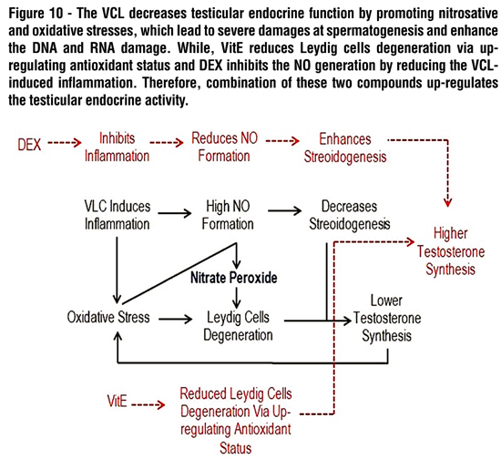 In fact, the VCL-induced free radicals promote the NO peroxidation and result in nitrate peroxide formation, which will enhance the damages in testicular tissue (33, 35). The generated Oxidative and NO-dependent stresses result in severe damages at DNA, RNA and proteins levels (31, 36, 37). Therefore, preventing the NO generation by DEX and inhibiting its peroxidation by down-regulating the VCL-induced oxidative stress via VitE are able to decrease the damages in testicular tissue. This hypothesis was proofed with our findings. Accordingly, our biochemical analyzes showed that, the animals in treated groups (especially in Vit E+DEX-received group) presented decreased NO content. These findings were supported by histopathological observations such as enhanced steroidogenic activities of Leydig cells as well as up-regulated TDI and RI indices in DEX and VitE co-administrated group (Figure-10).