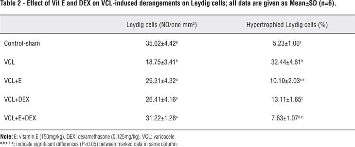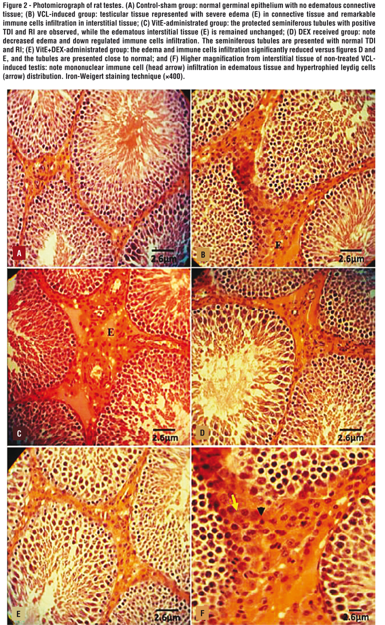 We lastly showed that the silymarin was able to elevate the VCL-reduced testicular weight (31). Current study showed that the simultaneous administration of the VitE and DEX was able to preserve the testicular to total body weight ratio more significant than that of silymarin as a unique antioxidant compound. This finding suggests that co-administration of an anti-inflammatory compound with an antioxidant agent leads to better result, which may be attributed to lower testicular degeneration.