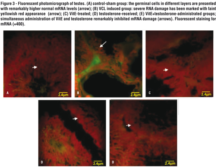 The fluorescent analyze was performed to examine the RNA damage in germinal cells. The pathological effect of VCL after 60 days resulted in severe RNA damage in all germinal epithelium layers, which was characterized with faint red fluorescent appearance (Figures 3 A-E). The percentage of tubules with RNA damage in non-treated VCL groups was significantly (P<0.05) higher than that of control-sham. Unlike the VCL-induced testes, the DEX and VitE alone-and- simultaneously treated animals exhibited lower percentage of tubules with degenerated RNA (Figure 4-A).