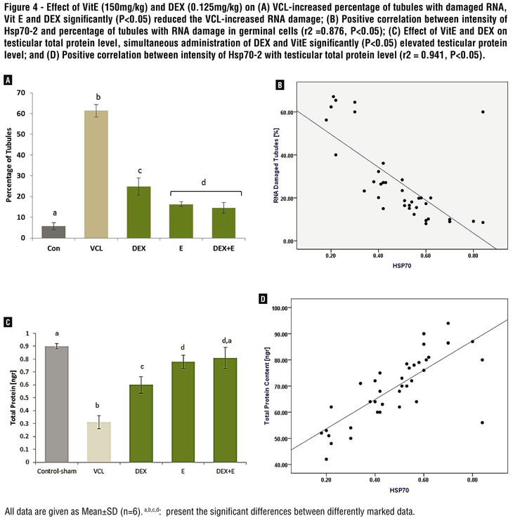 Results: VitE and DEX in simultaneous form of administration significantly (P<0.05) down-regulated the tissue ALP level and attenuated the VCL-decreased GSH-px, SOD and TAC levels and remarkably (P<0.05) down-regulated the testicular malondialdehyde (MDA) and nitric oxide (NO) contents. The VCL-induced histopathological alterations significantly (P<0.05) improved in VitE and DEX-administrated animals. The VitE and DEX co-administration reduced the VCL-increased RNA damage and elevated the Leydig cells steroidogenic activity. The Hsp70-2 protein level completely (P<0.05) increased in VitE and DEX alone-and-simultaneous-administrated animals. Finally, the VitE and DEX could significantly (P<0.05) improve the VCL-decreased semen quality and improved the sperm DNA integrity and chromatin condensation.